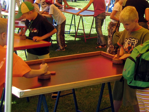 Bei diesem Spiel versucht ihr, den Spielstein bei eurem Gegner oder eurer Gegnerin im Tor zu versenken. Mit dem Holzklöppel stoßt ihr den Spielstein an.