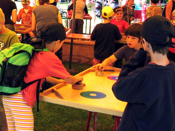 Bei diesem Spiel versucht ihr, den Spielstein in anderen Toren zu versenken. Mit dem Holzklöppel stoßt ihr den Spielstein an.