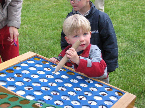 In einem Kasten sind viele Felder, die teilweise mit einer Murmel gefüllt sind. Wer ein Feld mit einer Murmel erwischt bekommt einen kleinen Preis.