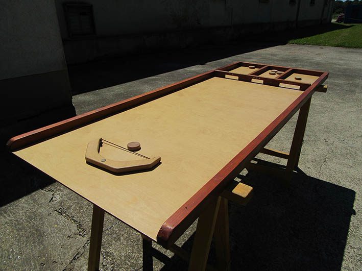 Mithilfe des Gummis werden 15 Spielsteine in die drei Kästen mit unterschiedlicher Punktzahl "geschossen" .