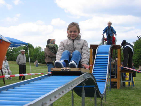 20 m Rutschvergnügen pur in Holzschlitten, mit Wellen, wie auf einer kleinen Achterbahn. Abrollhöhe 1,80m.