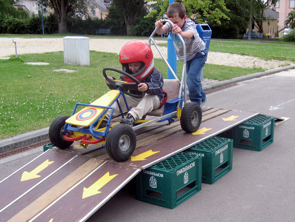 Aufgebaut wird ein Geschicklichkeitsparcours mit Ampel, Wippe, Brücke, Slalom, "Wasserdusche", usw. Die Kinder melden sich in Zweierteams beim Rennbüro an. Helm auf; Start frei. Ein Kind lenkt, das andere schiebt, zwischendrin ist FahrerInnenwechsel.