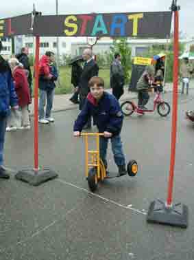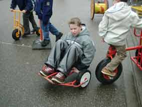 Robustes Fahrzeug mit Pedalantrieb. Die bewegliche Hinterachse wird mit den Händen gelenkt.