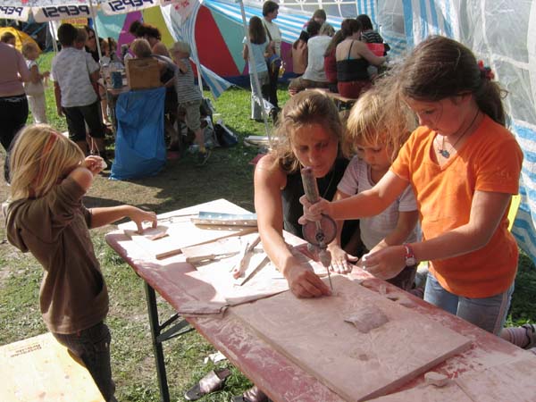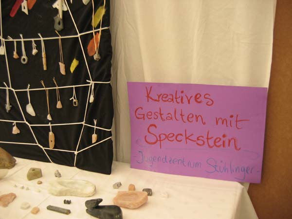 Dies ist eine "echte" Kunsthandwerkstatt bei der sich jeder sein eigenes Schmuckstück herstellen kann. Aus großen Steinen werden kleine Brocken heraus gesägt und dann mit Feilen, Raspeln, Bohrern und Schleifpapier so lange bearbeitet, bis sie dem Besitzer gefallen.