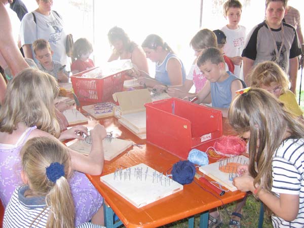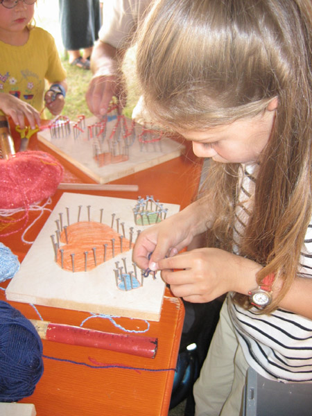 Diese Werkstatt verbindet die eher handwerkliche Tätigkeit des Nagelns mit der künstlerischen Gestaltung. Deshalb ist diese Werkstatt sowohl bei Mädchen als auch bei Jungs beliebt. Ein Motiv kann entweder erst auf ein Blatt Papier gemalt und dann aufs Holz übertragen werden oder gleich direkt aufs Holz. Nach dem Einschlagen von Nägeln auf den Linien geht die eigentliche Gestaltung mit farbiger Wolle los, indem Wollfäden mehr oder weniger kunstvoll um die Nägel geschlungen werden. Mit viel Fleiß entsteht so ein Kunstwerk, bei dem die Nägel kaum mehr zu sehen sind.