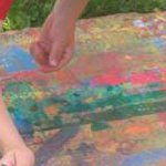 Mit Spezialfarben kann jedes Kind mit verschiedenen Techniken ein A 4 Blatt gestalten, das später Teil einer großen Collage wird