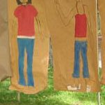 Packpapier wird auf eine Wand gepinnt, die Kinder stellen sich davor und malen ihre Körperumrisse nach und gestalten diese.