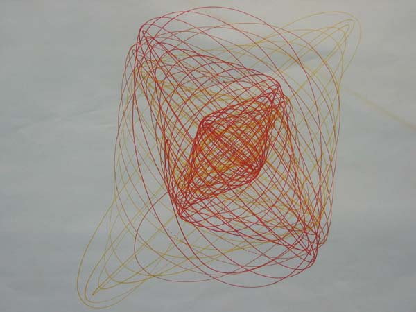 Wird das hängende Brett in Schwingung versetzt, malt der Filzstift eliptische Formen. Es kann mehrfach mit verschiedenen Farben auf das gleiche Blatt gezeichnet werden, so entstehen die interessantesten Bilder.