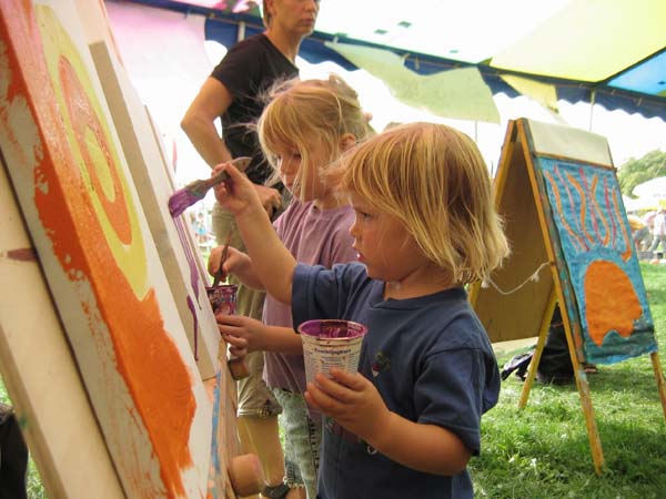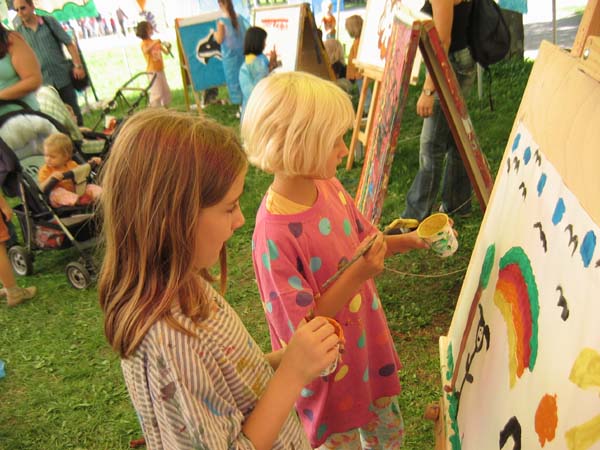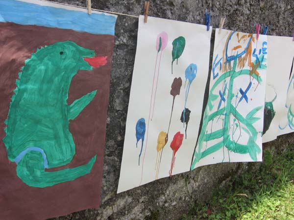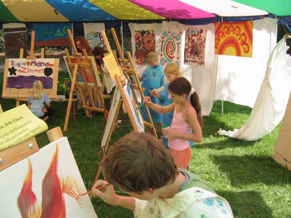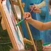 An großen Staffeleien wird auf Papier mit wasserlöslichen Farben frei gemalt.