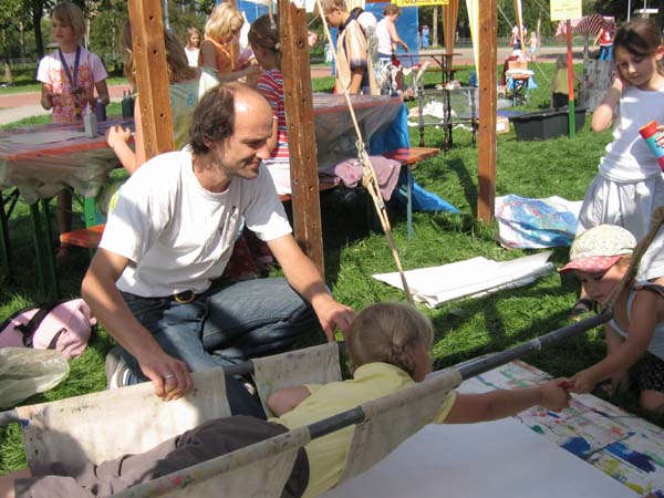 Bei dieser Technik ist die Malerin oder der Maler in Bewegung: auf einer Schaukel bäuchlings liegend versuchen die Kinder mit Pinsel und Farbe auf ein unter der Schaukel liegendes Blatt Papier ein Bild zu kreieren. Dies ist nicht unbedingt einfach, macht aber viel Spaß!