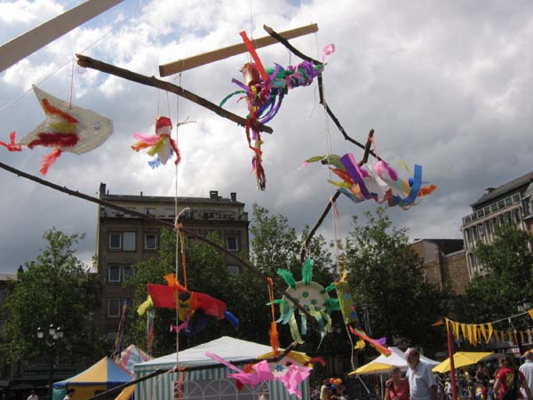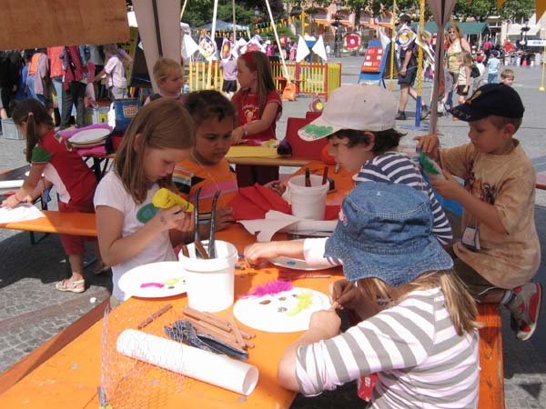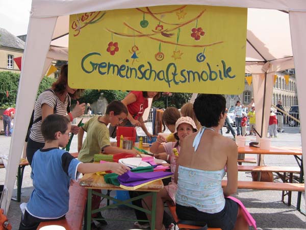 Bei dieser Werkstatt nehmen die Kinder in der Regel die gebastelten Teile nicht gleich mit. Sie sollen alle Teil eines großen Mobiles werden, das auf dem Aktionsplatz aufgehängt wird.