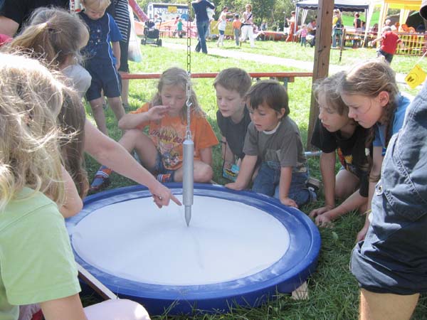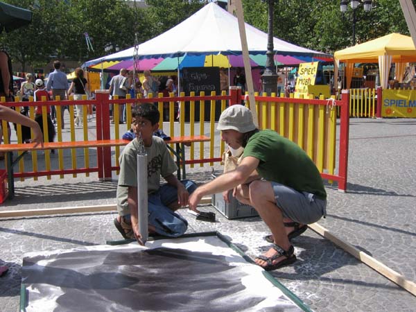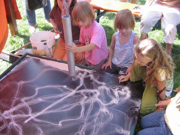 Hier entstehen vergängliche, aber sehr reizvolle Kunstwerke. Außerdem steht eher im Vordergrund der Entstehungsprozess, bei dem viele Kinder und Erwachsene zuschauen können.