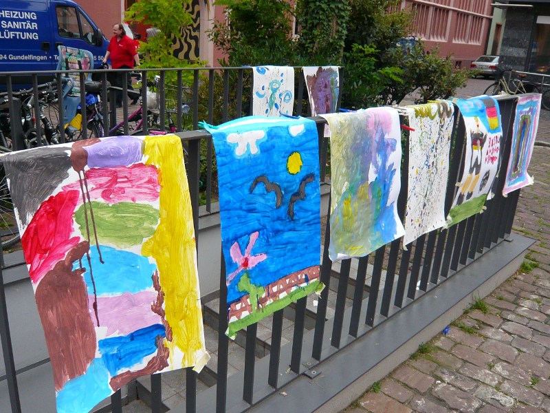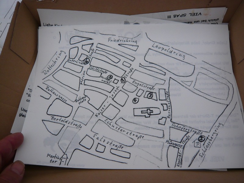 Von hier aus bestand die Möglichkeit zu einer Spielrallye durch die Innenstadt aufzubrechen. Dabei gab es z.B. ein Entdeckerspiel in der Stadtbibliothek, Steinspielchen und Kreidemachen auf dem Münsterplatz und Papierschiffrennen am Bächle. Über 100 Kinder nahmen an dieser Rallye teil.