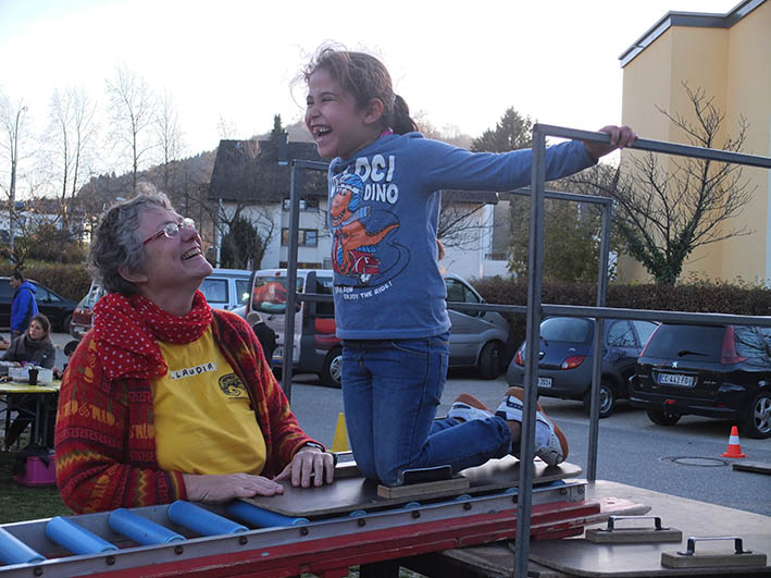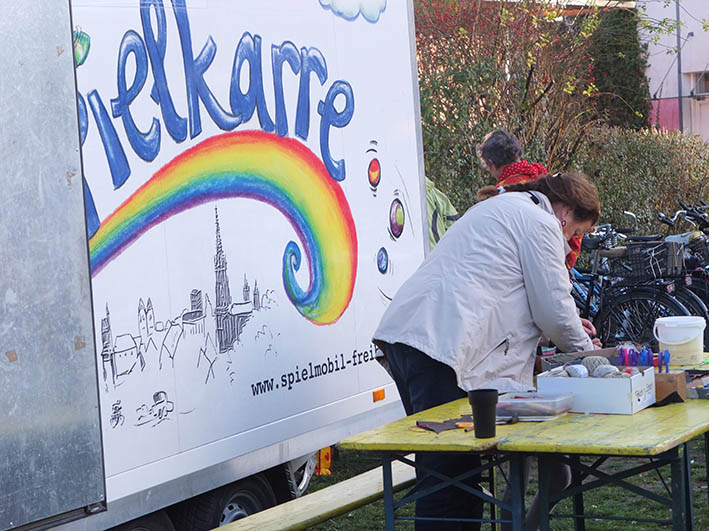 Das Spielmobil bot am Sonntag, 15.11. zum fünften Mal für die Flüchtlingskinder aus der EA eine Spielaktion an. Das Programm wurde wieder von Spielmobil-MitarbeiterInnen und MitarbeiterInnen vom Kinder-und Jugendhaus St. Georgen, sowie Freunden und Bekannten ehrenamtlich durchgeführt. Spielort war diesmal der Parkplatz der Freien Waldorfschule St. Georgen. Die "Flüchtlingshilfe Freiburg" hatte die Turnhallen der Schule für eine Kleiderausgabe zur Verfügung gestellt bekommen. Die Kinder konnten sich selbst Hüpfseile herstellen und Hüpfspiele machen. Brettspiele und Rollenrutsche waren natürlich auch dabei.