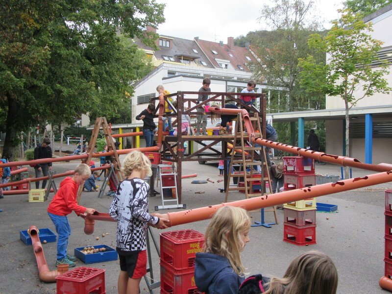 Von einem großen Podest herab wird gemeinsam aus langen Rohren, Winkeln und Stützen eine Riesenmurmelbahn gebaut. Mit Kurven, freiem Fall, eingebauten Geräuschen etc. sind der Kreativität dabei keine Grenzen gesetzt.
