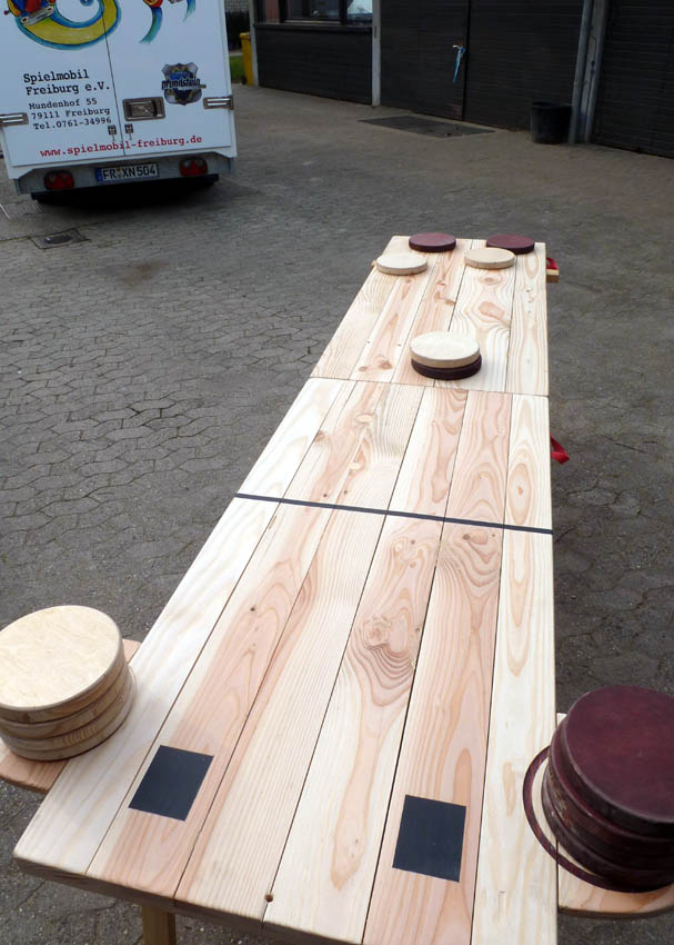 Der Spieler stellt sich an den Tisch zwischen die Stützen und versucht, einen Spielteller über die 80cm entfernte Linie, die sich auf dem Tisch befindet, zu werfen. (Der Spielteller darf nicht geschoben werden). Dann wirft der Zweite.