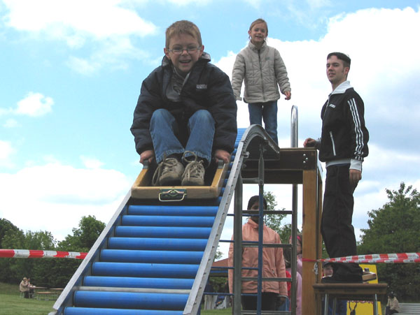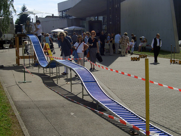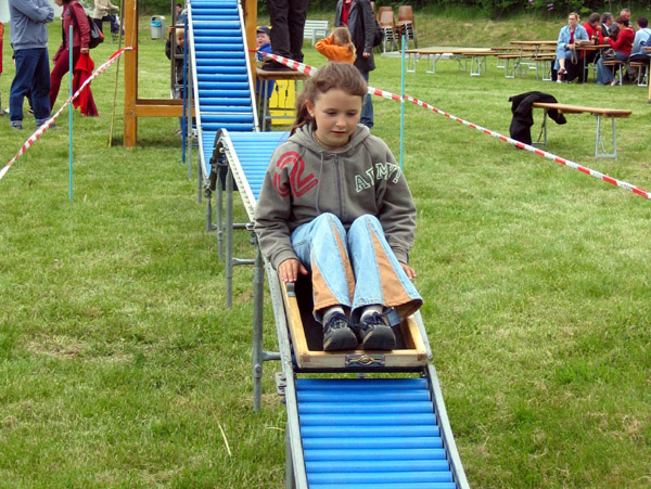 Das ist Rutschvergnügen pur in sicher geführten Holzschlitten; wie auf einer kleinen Achterbahn. Ob vorwärts, rückwärts oder sogar zu zweit in einem Schlitten. Die Schlitten lassen sich auch zu kleinen Zügen verbinden. Bis zu drei Wagen sausen dann gemeinsam die Bahn hinab, oft unter dem lauten Juchzen der Kinder. Die "Super-Wellenrutsche" - ein Highlight auf jeder Veranstaltung.