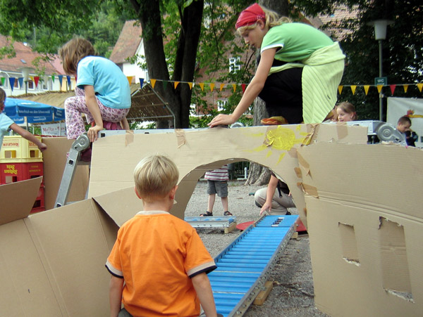Mit von uns bereitgestellten Materialien bauen die Kinder gemeinsam ein Schienennetz mit erforderlicher Infrastruktur wie Bahnhof, Tunnel und anderem auf und organisieren damit einen Bahnbetrieb.