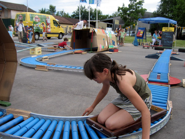 Aus Rollenbahnen, die auf dem Boden liegen, entsteht eine Eisenbahnlandschaft, mit Kurven, Drehscheiben und Bahnübergängen.