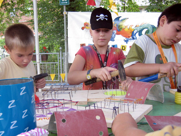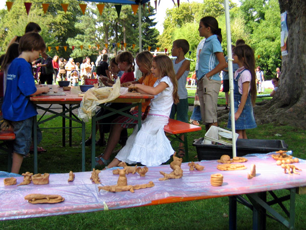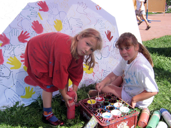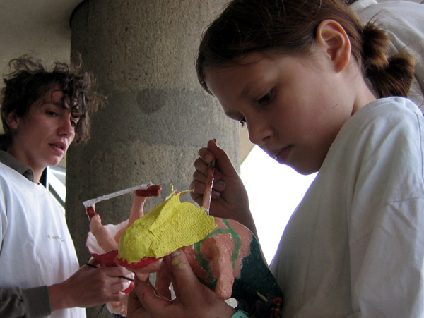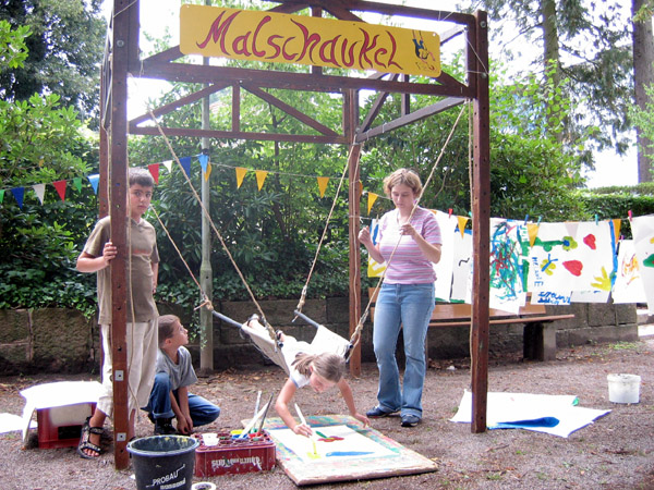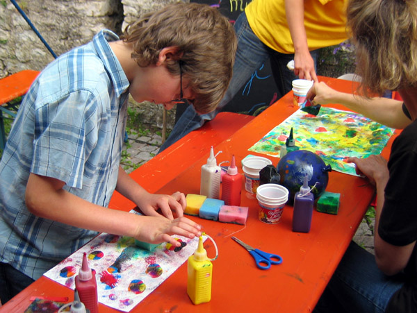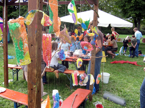 Sie können wählen zwischen Angeboten, bei denen gemeinschaftlich nur unter Mithilfe vieler Kinder ein Produkt entstehen kann( Großbilder, Skulpturen, Riesenmobiles usw.) und Werkstätten, in denen sich jedes Kind um sein eigenes Kunstwerk kümmert, das es dann auch mit nach Hause nehmen kann.