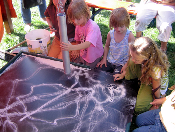 Außergewöhnliche Methoden der Bilderproduktion wie zum Beispiel die Farbzentrifuge, das Sandpendel oder das Kurvenmalbrett faszinieren alle Altersgruppen, hier kann sich jeder mal als Künstler*in fühlen. Die Angebote haben unterschiedliche Schwierigkeitsgrade und das komplette Programm kann auf die jeweilige Veranstaltung individuell zugeschnitten werden.