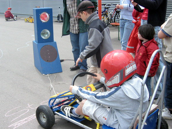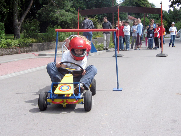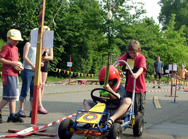 Aufgebaut wird ein Geschicklichkeitsparcours mit Ampel, Wippe, Brücke, Slalom, "Wasserdusche", usw. Die Kinder melden sich in Zweierteams beim Rennbüro an. Helm auf; Start frei. Ein Kind lenkt, das andere schiebt, zwischendrin ist FahrerInnenwechsel.