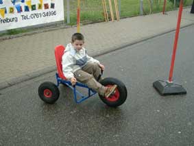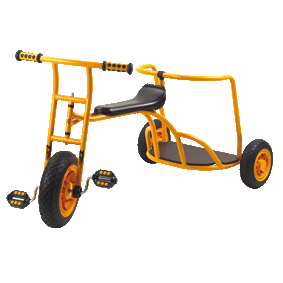 Robustes Fahrzeug mit Pedalantrieb. Die bewegliche Hinterachse wird mit den Händen gelenkt.