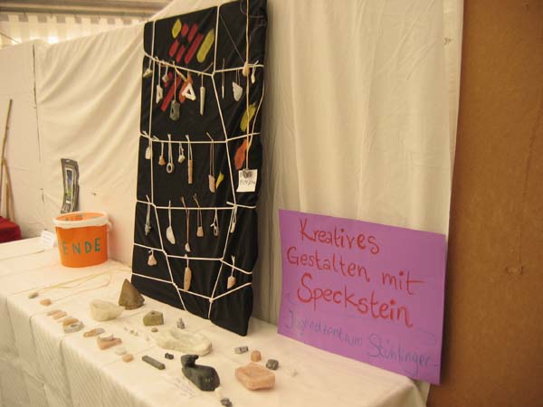 Dies ist eine "echte" Kunsthandwerkstatt bei der sich jeder sein eigenes Schmuckstück herstellen kann. Aus großen Steinen werden kleine Brocken heraus gesägt und dann mit Feilen, Raspeln, Bohrern und Schleifpapier so lange bearbeitet, bis sie dem Besitzer gefallen.