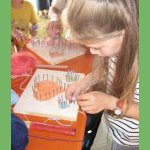 Mit Hilfe einer Buttonmaschine werden die Vorlagen der Kinder zu schönen Ansteckern verarbeitet.