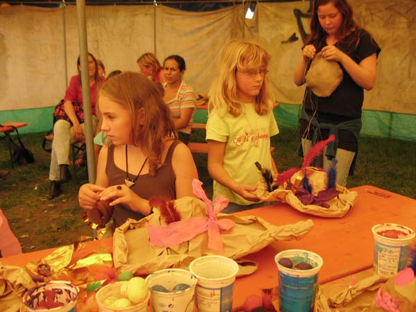 Für die Herstellung der Hüte sind neben dem Grundmaterial Packpapier fast alle Materialressourcen tauglich. Glitzerndes Deko-Material kann auch ersetzt werden durch Naturmaterialien, Reste aus der Schneiderei lassen sich auch gut verwerten. Keine Hutwerkstatt ist wie die vorherige.