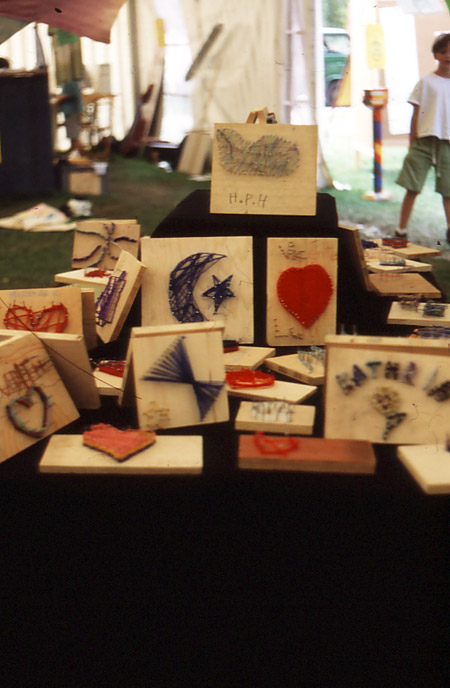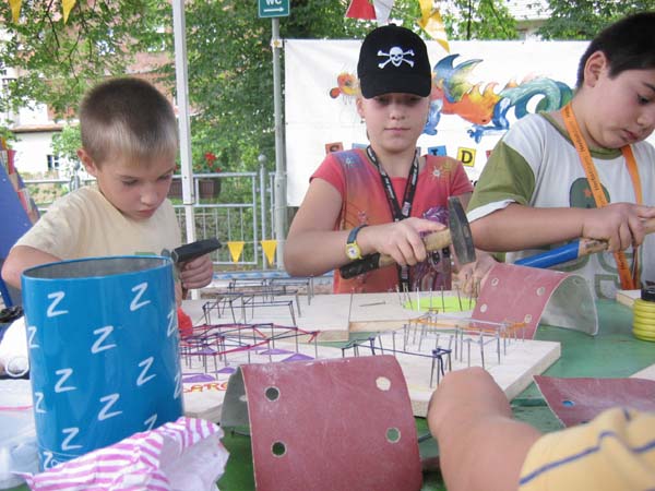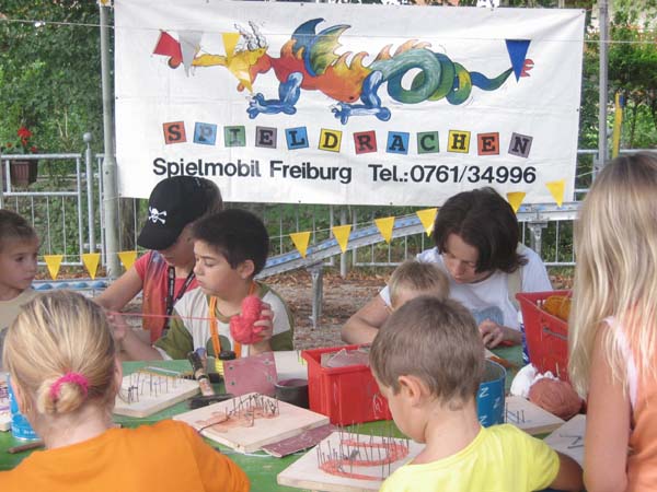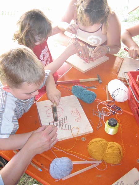 Diese Werkstatt verbindet die eher handwerkliche Tätigkeit des Nagelns mit der künstlerischen Gestaltung. Deshalb ist diese Werkstatt sowohl bei Mädchen als auch bei Jungs beliebt. Ein Motiv kann entweder erst auf ein Blatt Papier gemalt und dann aufs Holz übertragen werden oder gleich direkt aufs Holz. Nach dem Einschlagen von Nägeln auf den Linien geht die eigentliche Gestaltung mit farbiger Wolle los, indem Wollfäden mehr oder weniger kunstvoll um die Nägel geschlungen werden. Mit viel Fleiß entsteht so ein Kunstwerk, bei dem die Nägel kaum mehr zu sehen sind.