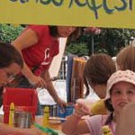 Mit selbstgebauten Gummistempeln, Luftballons und ähnlichem werden Bilder gestaltet