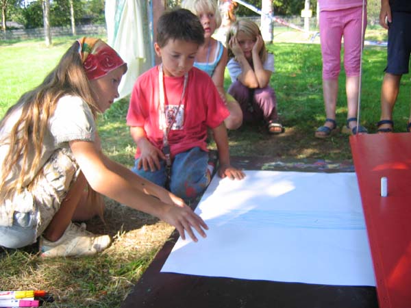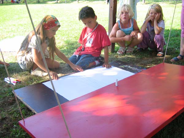 Wird das hängende Brett in Schwingung versetzt, malt der Filzstift eliptische Formen. Es kann mehrfach mit verschiedenen Farben auf das gleiche Blatt gezeichnet werden, so entstehen die interessantesten Bilder.