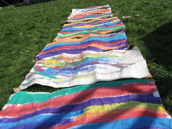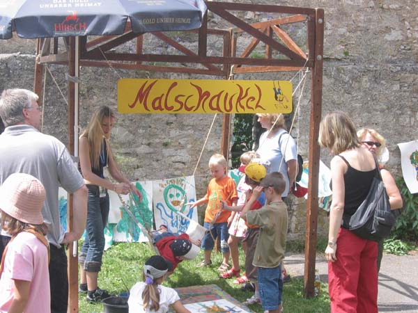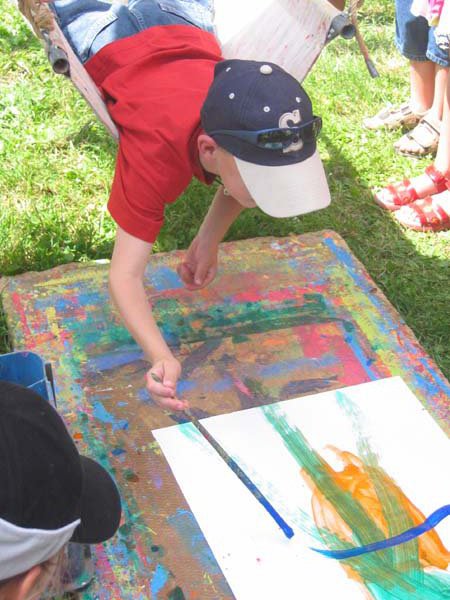 Bei dieser Technik ist die Malerin oder der Maler in Bewegung: auf einer Schaukel bäuchlings liegend versuchen die Kinder mit Pinsel und Farbe auf ein unter der Schaukel liegendes Blatt Papier ein Bild zu kreieren. Dies ist nicht unbedingt einfach, macht aber viel Spaß!