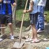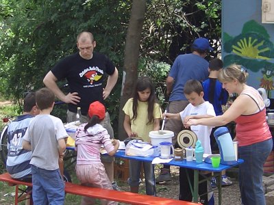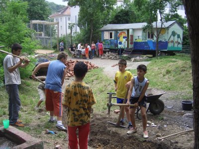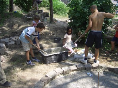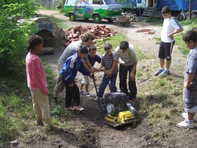 In den Pfingstferien ging es mit Beteiligung von Kindern, Jugendlichen und Anwohnern los. So wurde ein neuer Wasserlauf angelegt und mit der Gestaltung einer neuen Feuer- und Grillstelle begonnen. Mit großem Einsatz waren insbesondere die Kinder mit dabei.