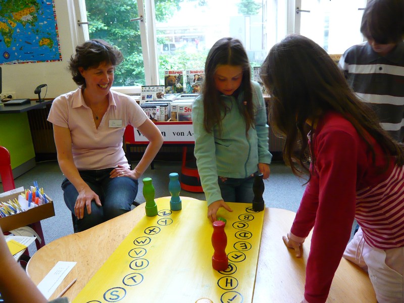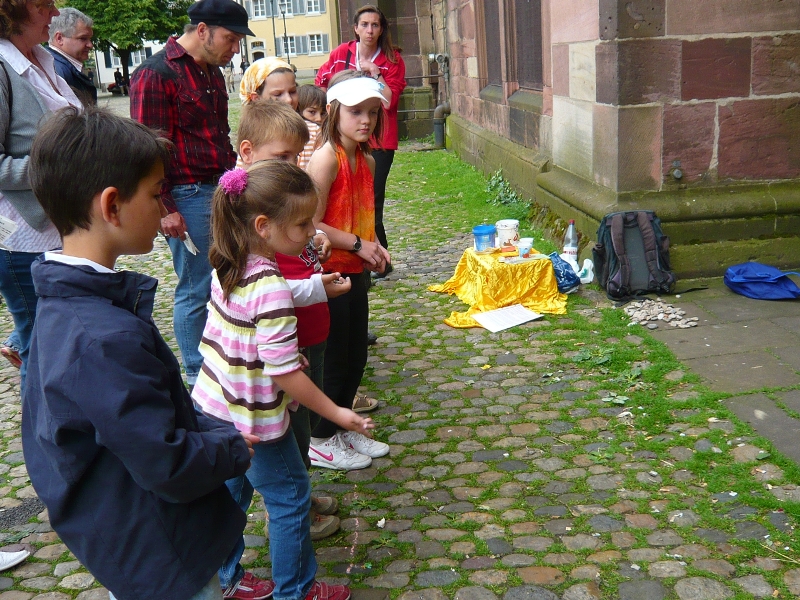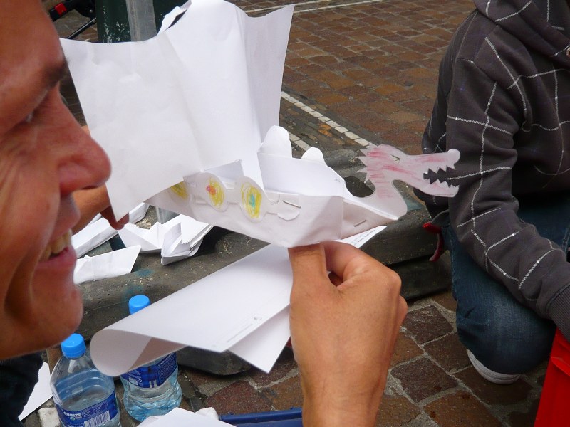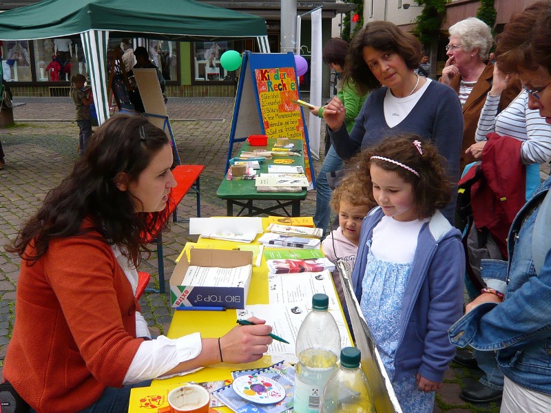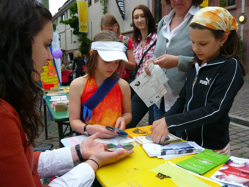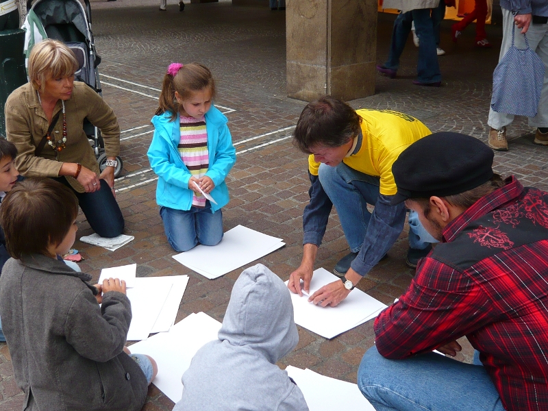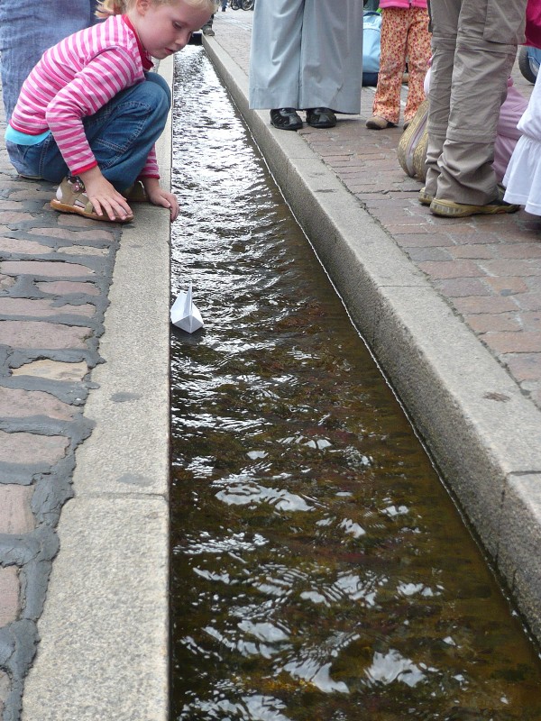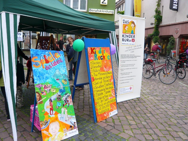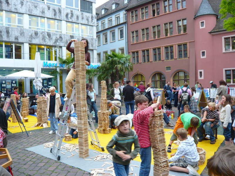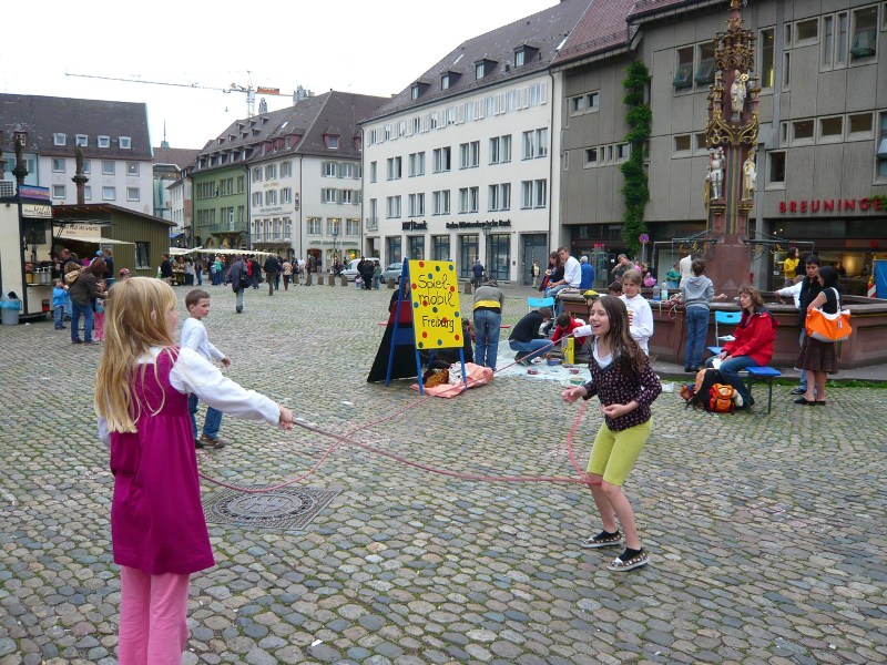 Von hier aus bestand die Möglichkeit zu einer Spielrallye durch die Innenstadt aufzubrechen. Dabei gab es z.B. ein Entdeckerspiel in der Stadtbibliothek, Steinspielchen und Kreidemachen auf dem Münsterplatz und Papierschiffrennen am Bächle. Über 100 Kinder nahmen an dieser Rallye teil.
