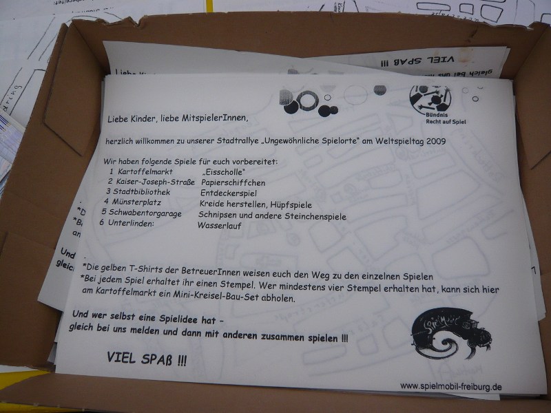 Anlässlich des Weltpieltages am 28. Mai 2009 haben Spielmobil, Kinderbüro, Stadtbibliothek und der Kinderabenteurhof Vauban eine Spielaktion auf dem Kartoffelmarkt mit Spielrallye in der Innenstadt angeboten.