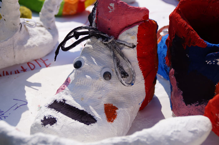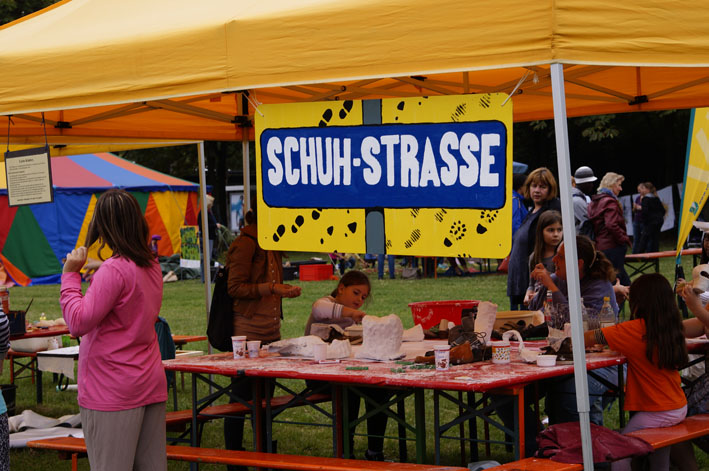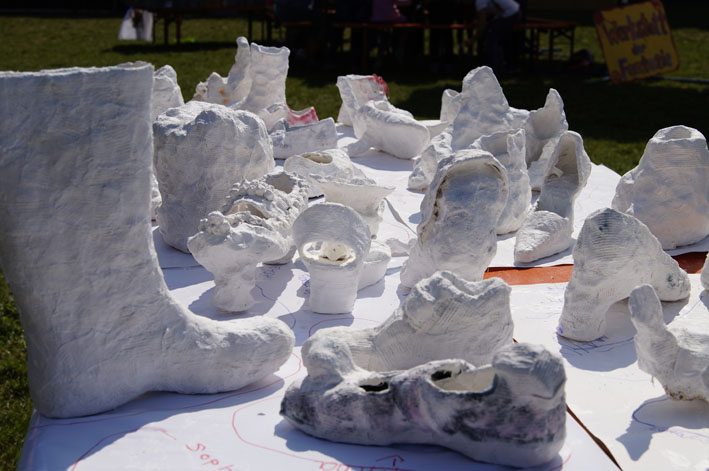 Mit alten Schuhen, Gipsbinden und Farbe wurden in der „Schuhstraße“ neue Kunstwerke geschaffen, die teilweise nicht mehr als Schuhe erkennbar waren.
