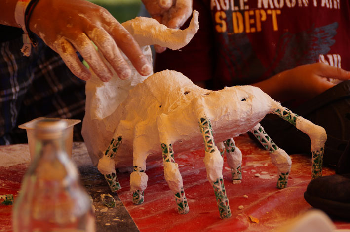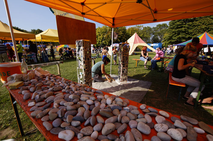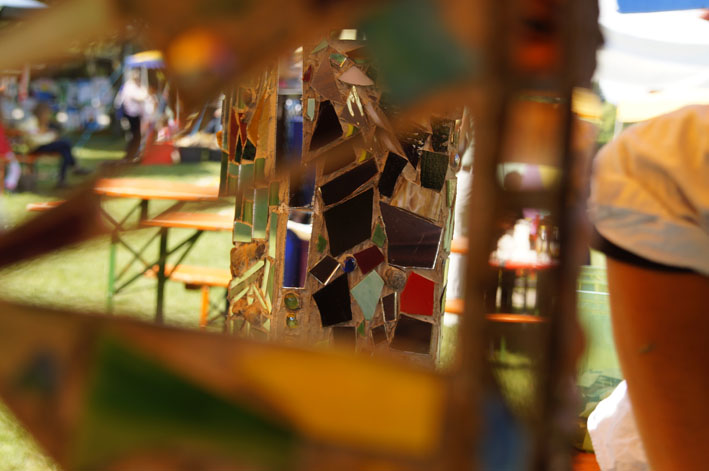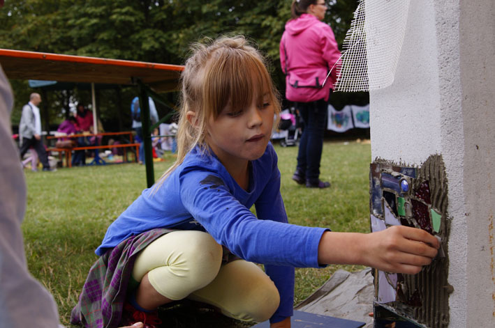 Eine aufwändige, aber schöne Werkstatt wurde von Jugendzentrum Letz Fetz angeboten. Aus Spiegeln und Buntglas schnitten sich die Kinder Mosaikteilchen mit dem Glasschneider zurecht und klebten sie auf eine Säule aus Yton. Da hier nur sehr wenige Kinder mitmachen konnten, gab es noch die Möglichkeit, mit demselben Material große Rheinkiesel zu verzieren.
