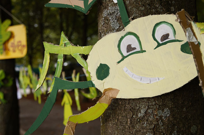 Eine sehr schöne und einfache Gestaltungsidee mit Karton war eine „Camouflage“ mit ausgeschnittenen und bemalten Tierfiguren, die am Rande des Platzes, an und in Bäumen und an Zäunen arrangiert wurden.