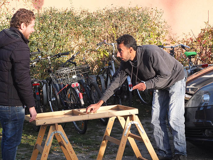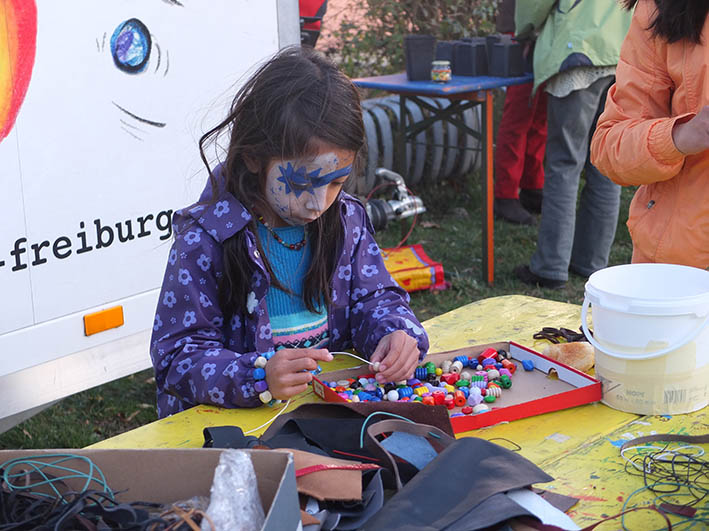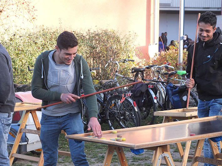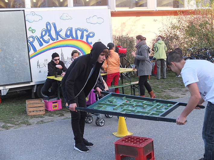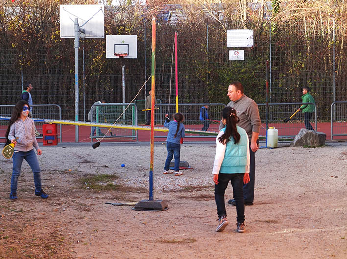 Das Spielmobil bot am Sonntag, 15.11. zum fünften Mal für die Flüchtlingskinder aus der EA eine Spielaktion an. Das Programm wurde wieder von Spielmobil-MitarbeiterInnen und MitarbeiterInnen vom Kinder-und Jugendhaus St. Georgen, sowie Freunden und Bekannten ehrenamtlich durchgeführt. Spielort war diesmal der Parkplatz der Freien Waldorfschule St. Georgen. Die "Flüchtlingshilfe Freiburg" hatte die Turnhallen der Schule für eine Kleiderausgabe zur Verfügung gestellt bekommen. Die Kinder konnten sich selbst Hüpfseile herstellen und Hüpfspiele machen. Brettspiele und Rollenrutsche waren natürlich auch dabei.