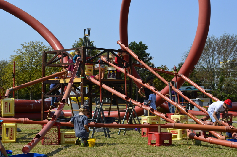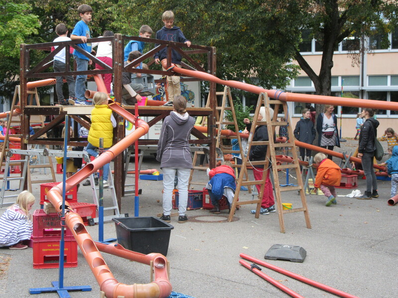 Von einem großen Podest herab wird gemeinsam aus langen Rohren, Winkeln und Stützen eine Riesenmurmelbahn gebaut. Mit Kurven, freiem Fall, eingebauten Geräuschen etc. sind der Kreativität dabei keine Grenzen gesetzt.